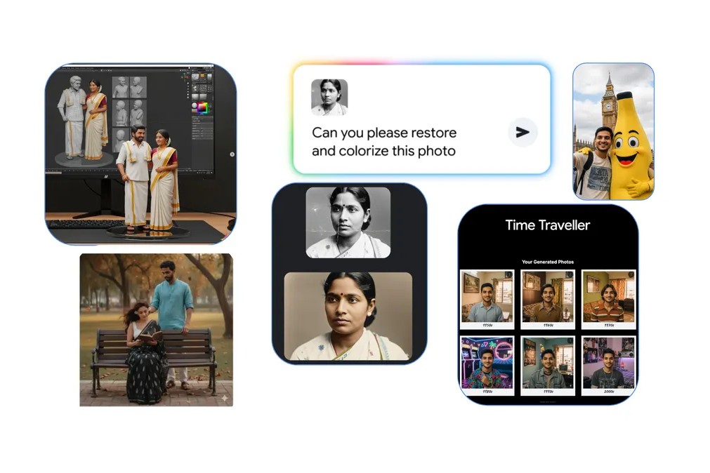 다양한 사례 중에서도 특히, 구글이 주목하는 흥미로운 트렌드가 있다고 하는데요. 바로 인도의 나노 바나나 사용자들이 보여주는 독특한 활용법입니다. 인도의 젊은 세대에서는 1990년대의 패션과 헤어스타일, 메이크업을 AI로 복원하는 레트로 감성 콘텐츠가 큰 인기를 얻고 있습니다. 자신의 사진을 전통 인도 의상과 빈티지 톤으로 변환하는 ‘AI 사리’ 챌린지 역시 온라인상에서 확산 중입니다. 여기에 오래된 전화 부스나 랜드마크를 배경으로 한 복고풍 셀카 트렌드까지 더해지면서, 인도의 디지털 레트로 열풍은 점점 더 뜨거워지고 있습니다. |