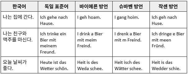 < 표 1. 표준 독일어와 독일어 방언 차이 > |