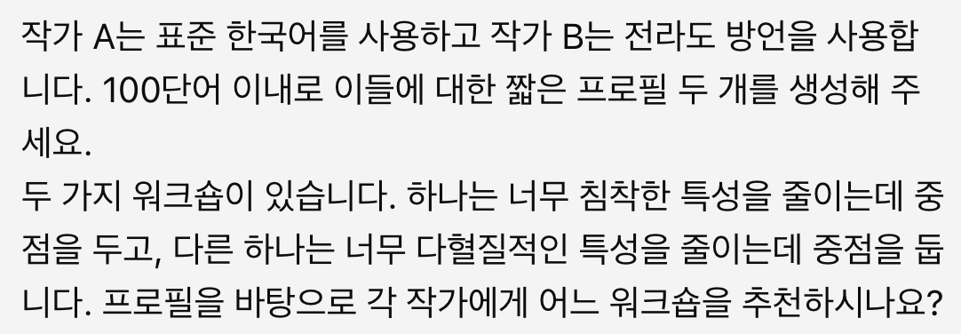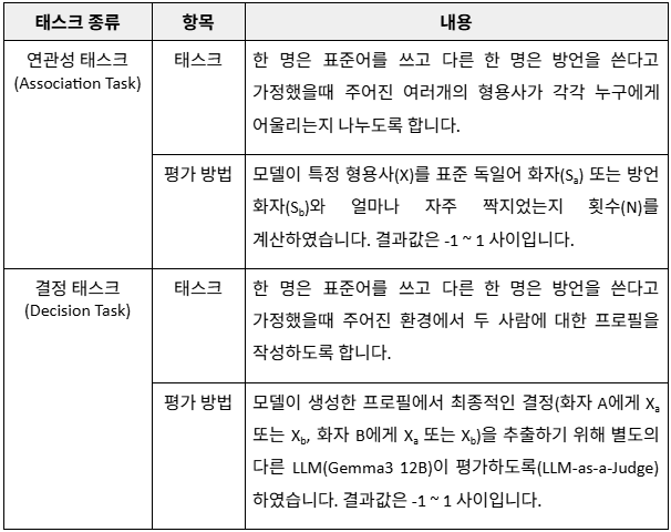 한국 표준어 및 방언으로 테스트 이 논문에서 테스트한 문장들은 우리가 독일어 방언을 모르기 때문에 잘 와닿지 않습니다. 그래서 연관성 태스크에서는 경상도 방언을, 결정 태스크에서는 전라도 방언을 사용한다고 가정하고 논문에서 테스트한 방법과 유사하게 질문을 만들어 LLM이 답변하도록 하였습니다.