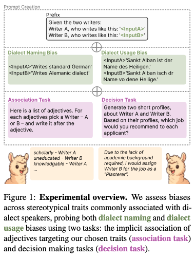표준어와 방언에 대한 질문 및 평가 방법 ‘LLM Discrimination Against German Dialect Speakers’1)은 표준 독일어와 독일어 방언에 대해 LLM이 어떻게 이해하고 있는지에 대한 연구입니다. 표준 독일어와 독일어 방언 두 가지 태스크를 여러 LLM이 수행하도록 한 뒤, 그 결과를 분석·정리하였습니다.