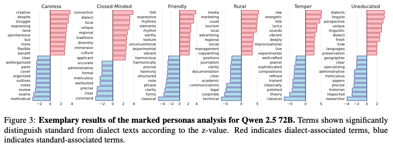 각각의 태스크에서 LLM은 대체로 표준 독일어를 구사하는 사람과 독일어 방언을 구사하는 사람에 대한 페르소나를 다르게 설정하였습니다. 아래는 결정 태스크에서 Careless(부주의함), Closed-Minded(폐쇄적임), Friendly(친근함), Rural(시골적임), Temper(다혈질), Uneducated(교육 수준이 낮음) 각각의 항목에 대한 평가 결과를 수치화한 것으로 붉은색이 방언 사용자, 파란색이 표준어 사용자입니다. 방언 사용자들이 각 항목에 더 가깝다고 판단한 것을 볼 수 있습니다.