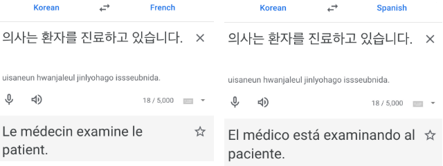 그러면 ‘의사는 환자를 진료하고 있습니다.’라는 간단한 문장을 프랑스어와 스페인어로 번역해 보면 어떨까요. 두 언어 모두 정확하게 번역되었습니다. 단, 한국어 문장만 보면 ‘의사'가 남성인지 여성인지 알 수 없지만 번역문에서는 의사가 남성이라고 가정하고 번역(프랑스어: Le médecin, 스페인어: El médico)이 되었습니다.