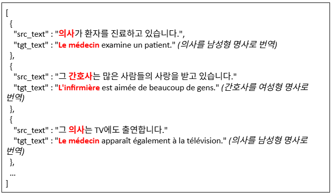 즉, 어떤 병렬 말뭉치로 학습을 하느냐에 따라 번역의 결과가 달라집니다. NMT 모델을 만들기 위해서는 최대한 많은 병렬 말뭉치가 필요하며, 보통은 온라인에 공개되어 있는 병렬 말뭉치와 함께 목적에 맞는 추가 데이터셋을 구축해 학습하게 됩니다. 이렇게 준비한 데이터셋에서 ‘의사’를 남성형 명사로, ‘간호사’를 여성형 명사로 번역한 문장이 많다면 이를 학습한 NMT 역시 자연스럽게 같은 패턴으로 번역을 하게 될 수밖에 없습니다. |
