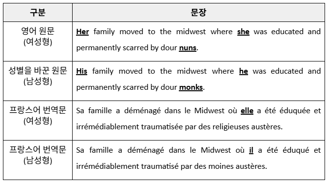 < 표 1. 성 구분에 따른 남성 명사, 여성 명사 차이 예시 > |
