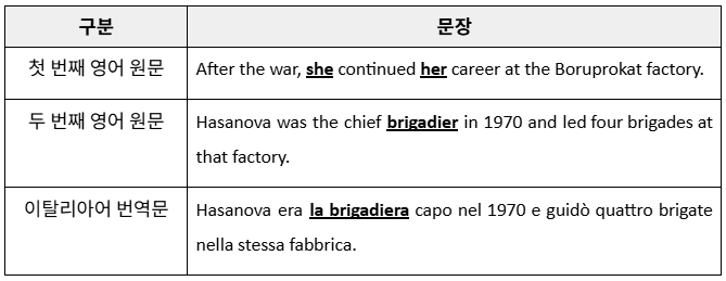 2) 문맥적 하위집합(Contextual Subset) 반사실적 하위집합과 마찬가지로, 위키피디아의 영어 문장 중에서도 남성 또는 여성에 대한 고정관념이 담긴 단어이지만 문장에서는 명확하게 성별을 알 수 없으며, 앞 문장과의 맥락을 통해서만 성별을 유추할 수 있는 문장들을 선별했습니다. 학습 데이터셋에서는 이러한 고정관념이 반영되어 있을 가능성이 높지만, 번역 모델은 고정관념에 의존하지 않고 문장 맥락에서 실제 성별을 파악해 번역을 해야 합니다.