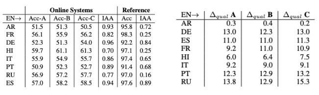 < 표 2. 상용 MT 성별 정확도 > < 표 3. 상용 MT 성별 젠더 격차 > |