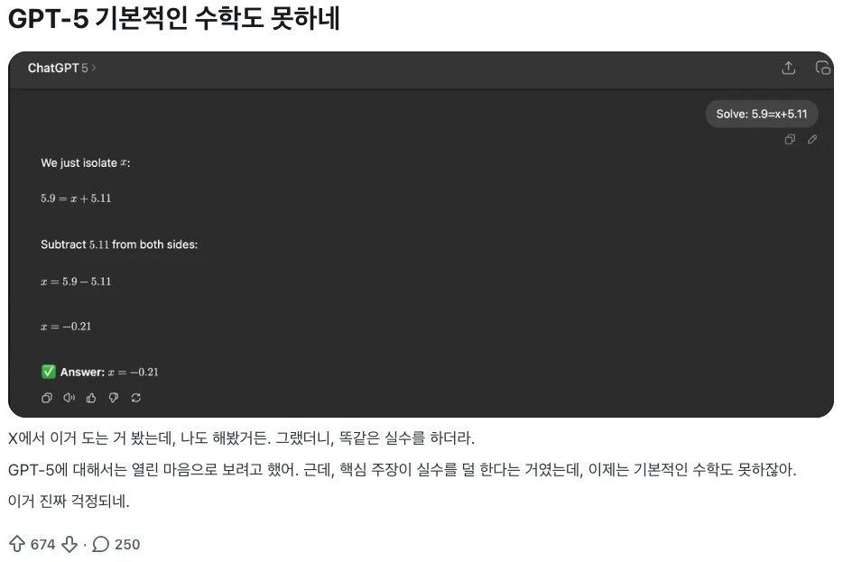 챗GPT의 능력은 소셜 미디어를 통해 입소문을 타고 빠르게 퍼져나갔고, 처음에는 우리가 쓰는 언어를 그대로 이해한다는 점에 놀랐습니다. 반면 간단한 사칙연산을 틀리는 경우도 종종 있었습니다. 복잡미묘한 사람의 말은 이해하면서 논리적으로 계산만 하면 되는 수학을 못 하는 점이 쉽게 이해되지 않았고, 사람들은 이런 사례들을 공유하며 초기에는 밈(Meme)처럼 유행했습니다. 이는 현재에도 발생하고 있는 문제로, 세계 최대 온라인 커뮤니티 중 하나인 레딧(Reddit)에 몇 달 전에 글이 올라왔는데 다른 사람들이 테스트해도 틀린 답변을 한다는 댓글들이 많았습니다.1)