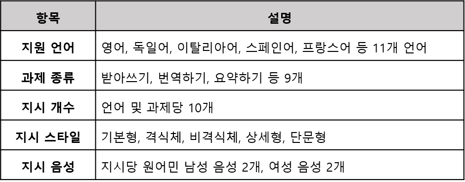 사람들은 일상에서 때와 장소에 따라 정중하게 말하기도 하고, 때로는 격의 없이 편하게 대화하기도 합니다. 전반적으로는 '글'보다는 '말'을 더 자주 사용하는 편이지만, LLM과 대화할 때는 이와는 반대로 주로 '글'을 씁니다. 'Do What I Say: A Spoken Prompt Dataset for Instruction-Following'은 일상을 그대로 반영해 '말'로 했을 때 LLM이 얼마나 잘 알아듣는지 평가하기 위해 구축된 데이터셋입니다. DOWIS에는 언어별로 다양한 지시(Instruction)가 음성으로 녹음되어 있습니다.